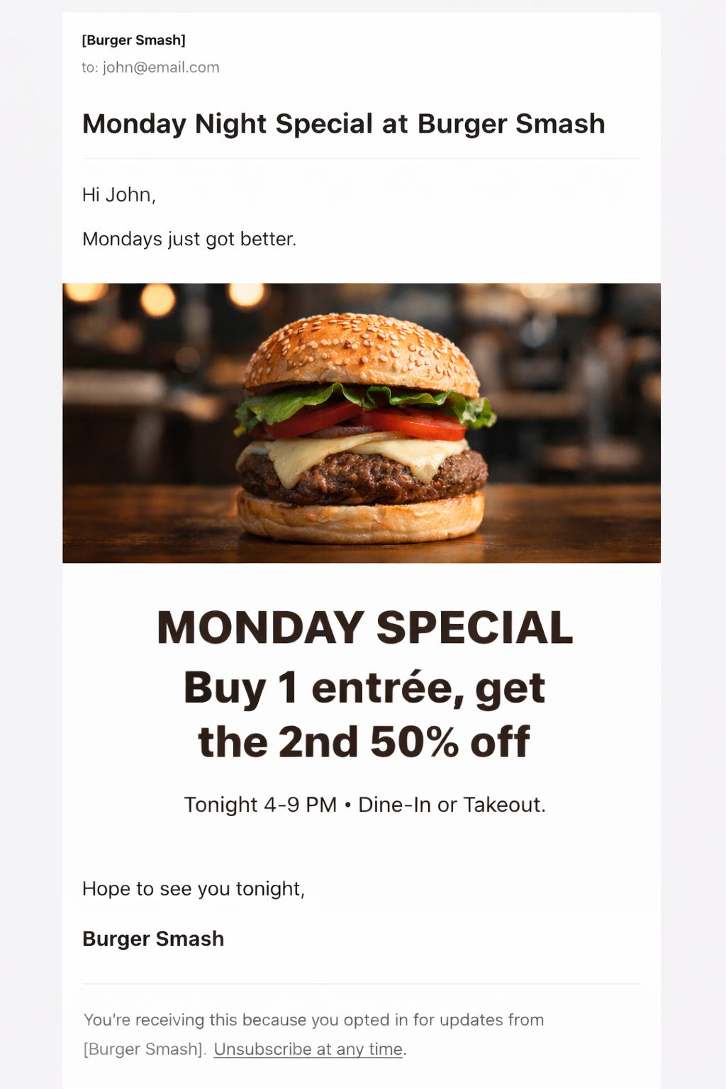 Send emails to keep customers informed, such as hours updates, timing changes, or announcements.